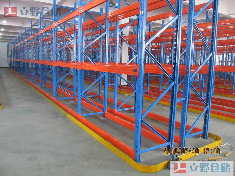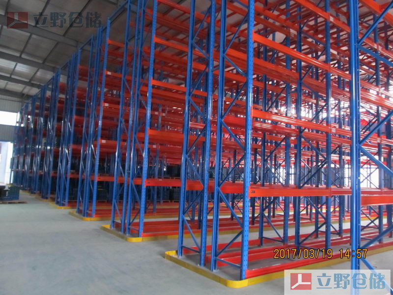 貨架系統主體為橫梁式貨架系統,區別在于貨架底部地面上加裝“三向堆垛叉車”的行動導軌。導軌常規采用不等邊角鋼。物料搬運叉車限為專用的“三向堆垛叉車”。三向堆垛叉車沿既定導軌滑行。貨架系統的堆垛通道寬度稍大于托盤貨物的寬度,高密度的存儲需求得以實現。